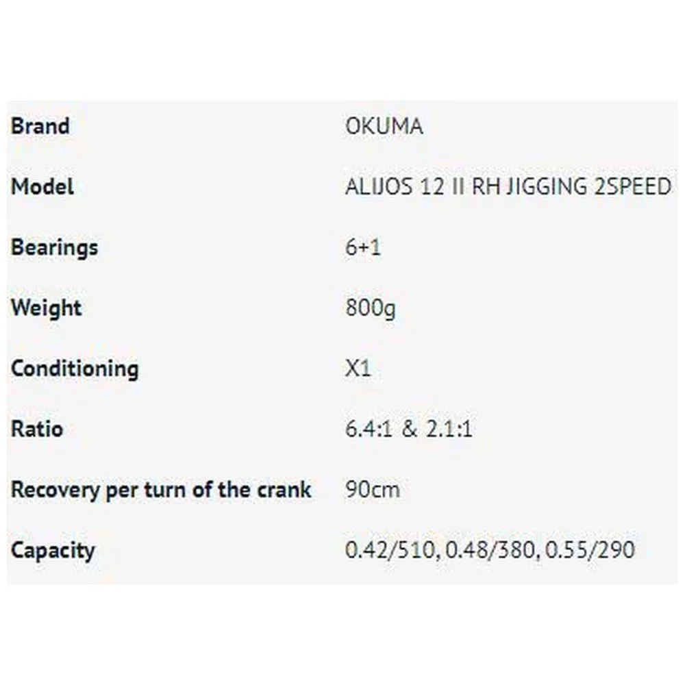 The Alijos 2-Speed Lever Drag is a lightweight, compact bodied, big fish stopping machine. Built with 6061-T6 machined aluminum for the ultimate in strength. The 1-piece frame continues around to the non-handle side, side plate which has a cast control system for precision spool control. The spool bearings are bathed in TSI oil giving it the ultimate in castability and frees spool. The Alijos reels feature a longer 90mm handle harm and oversized T-bar handle knob for great torque and comfort. The clicker mechanism has been reworked to give a louder clicking sound for trolling or dead stick applications. The new 2-speed shifting mechanism has been completely reworked by Okuma giving it the ultimate in shifting. The DFD: Dual Force Drag puts out tremendous drag pressure with its 100% larger drag plates.
